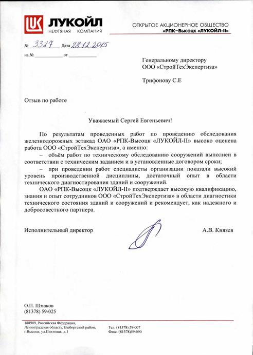 По результатам проведенных работ по проведению обследования железнодорожных эстакад ОАО «РПК-Высоцк «ЛУКОЙЛ-II» высоко оценена работа ООО «СтройТехЭкспертиза», а именно: