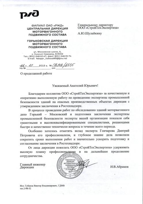 В процессе проведения работ по обследованию зданий моторвагонного депо Горький - Московский и подготовки заключения экспертизы промышленной безопасности эксперты вашей организации показали себя грамотными и высококвалифицированными специалистами, решающими быстро и качественно технически вопросы в течение всего периода.