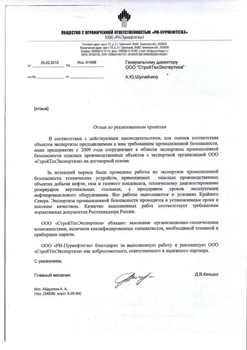 ООО «РН-Пурнефтегаз» благодарит за выполненную работу и рекомендует ООО «СтройТехЭкспертиза» как добросовестного, ответственного и надежного партнера.