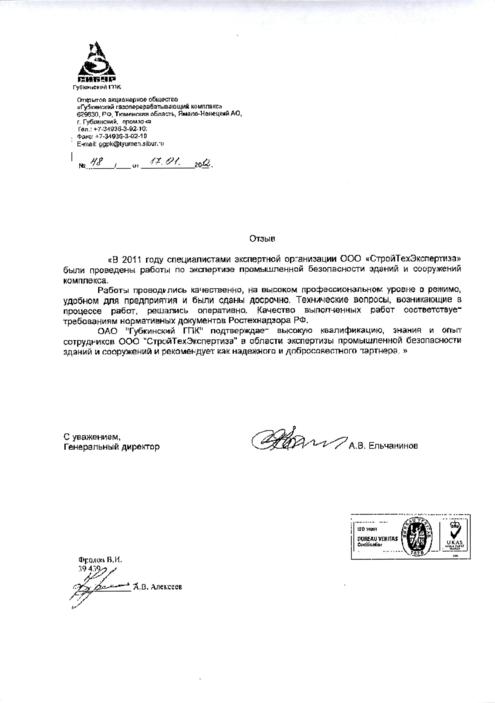 ОАО "Губкинский ГПК" подтверждает высокую квалификацию, знания и опыт сотрудников «СтройТехЭкспертиза» в области экспертизы промышленной безопасности зданий и сооружений и рекомендует итак надежного и добросовестного партнера.