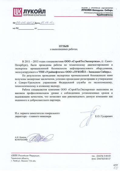 В 2011 - 2013 годах специалистами ООО «СтройТехЭкспертиза», (г. Санкт-Петербург), были проведены работы по техническому диагностированию и экспертизе промышленной безопасности нефтепромыслового оборудования, эксплуатируемого в ТПП «Урайиефтегаз» ООО «ЛУКОЙЛ - Западная Сибирь».