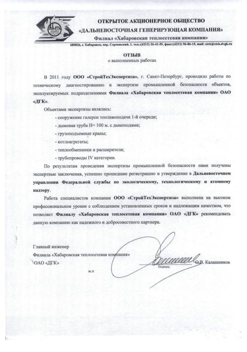 Работа специалистов компании ООО «СтройТехЭкспертиза» выполнена на высоком профессиональном уровне с соблюдением установленных сроков и надлежащим качеством, что позволяет Филиалу «Хабаровская теплосетевая компания» ОАО «ДГК» рекомендовать данную компанию как надежного и добросовестного партнера.