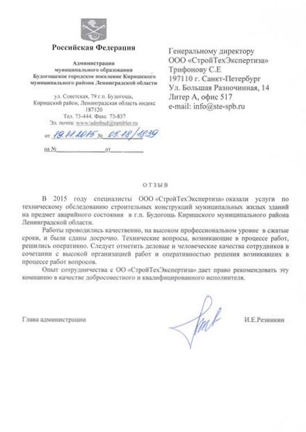 В 2015 году специалисты ООО «СтройТехЭкспертиза» оказали услуги по техническому обследованию строительных конструкций муниципальных жилых зданий на предмет аварийного состояния в г.п. Будогощь Киришского муниципального района Ленинградской области.
