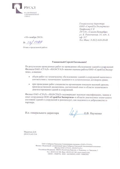 По результатам проведенных работ по проведению обследования зданий и сооружений Филиала ОАО «СУАЛ» «НАЗ-СУАЛ» высоко оценена работа ООО «СтройТехЭкспер-тиза», а именно: