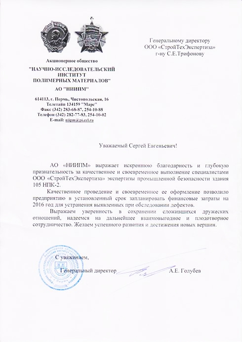 АО «НИИПМ» выражает искреннюю благодарность и глубокую признательность за качественное и своевременное выполнение специалистами ООО «СтройТехЭкспертиза» экспертизы промышленной безопасности здания 105 НПК-2.