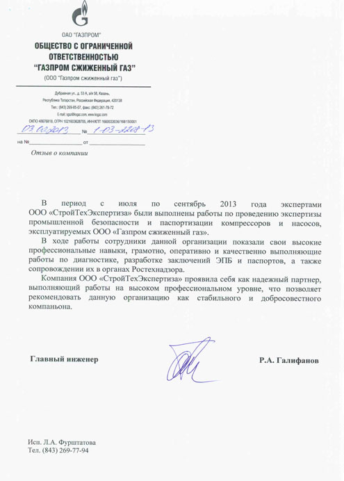 В период с июля по сентябрь 2013 года экспертами ООО «СтройТехЭкспертиза» были выполнены работы по проведению экспертизы промышленной безопасности и паспортизации компрессоров и насосов, эксплуатируемых ООО «Газпром сжиженный газ».