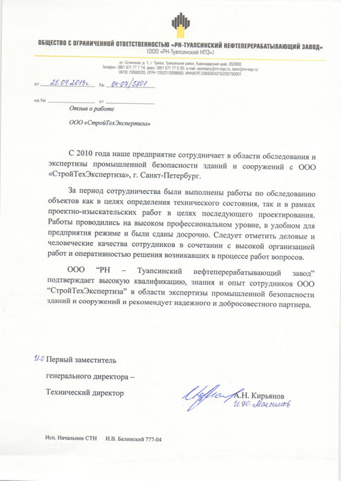 ООО "РН - Туапсинский нефтеперерабатывающий завод" подтверждает высокую квалификацию, знания и опыт сотрудников ООО «СтройТехЭкспертиза» в области экспертизы промышленной безопасности зданий и сооружений и рекомендует надежного и добросовестного партнера.