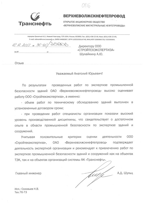 Учитывая положительные критерии оценки деятельности ООО «СтройТехЭкспертиза», ОАО «Верхневолжскнефтепровод» подтверждает деятельность экспертной организации и рекомендует к привлечению работ по экспертизе промышленной безопасности зданий и сооружений как на объектах ТЭК, так и на объектах организаций системы АК «Транснефть».